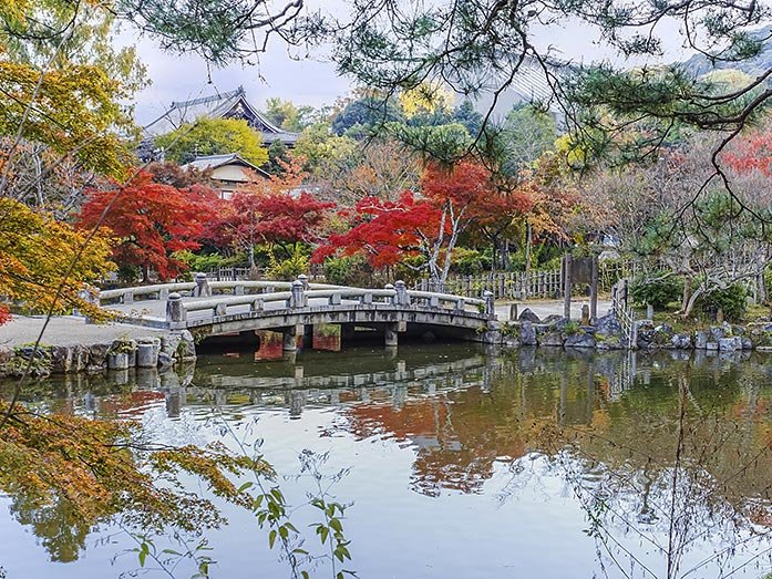The Tenryuji is the main temple of the Rinzai Zen Buddhism sect of the same name and is located in the Arashiyama district in the northwest of the city of Kyoto. It is the most important Zen temple in the city and is a UNESCO World Heritage Site. The temple was built in 1339 by Shogun Ashikaga Takauji, who dedicated it to the recently deceased Emperor Go-Daigo. Both men were former allies until Takauji rebelled against the emperor in the struggle for supremacy in Japan. The temple should pacify the spirit of the deceased. The buildings of Tenryuji have been repeatedly destroyed by fire over the centuries, so the current complex largely dates from the Meiji period (1868-1912). In contrast, the surrounding garden, which was designed by the well-known master of gardening, Muso Soseki, is still almost entirely original. Especially in autumn, when the foliage of the trees there and the Arashiyama mountains visible behind them turn red and yellow, the Tenryuji and its garden are a popular destination.